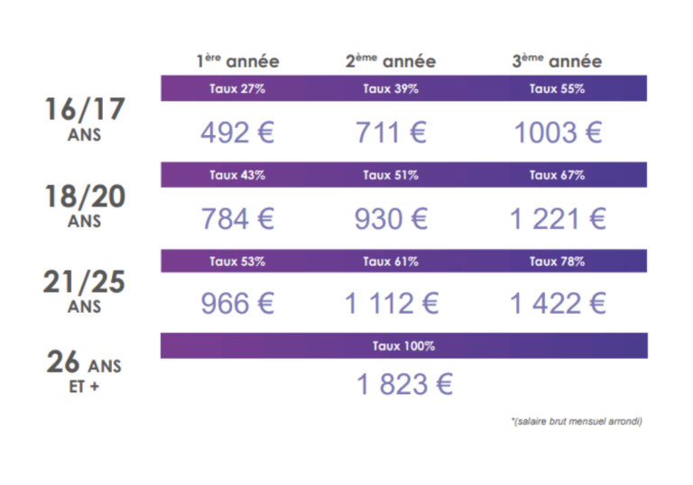 La rémunération dans le cadre d’un contrat d’apprentissage varie en fonction de l’âge de l’apprenti et augmente chaque nouvelle année d’exécution du contrat (de 27 % à 100 % du SMIC).